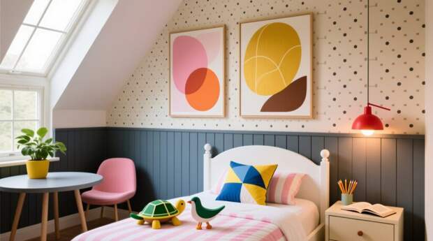 Результат? Стена, которая одновременно сдержанная и дерзкая, детская и взрослая, уютная и стильная. Такой приём идеально подходит тем, кто хочет создать в детской не «временную зону игрушек», а полноценное пространство с характером — там, где ребёнку будет интересно расти, а родителям — находиться.